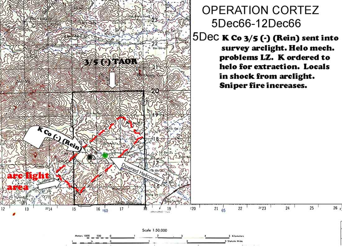 J. D. Murray was the Acting CO of Mike Company for five days during this operation, Captain Pettengill was on R&R for those first five days. This is J.D.'s research on that Operation, which involved Kilo and Mike Companies and the Battalion Command group. The first map is J.D.'s original operational map for the Op. There are 19 graphics for this Op, a mixture of maps and relevant pages from the AAR (After Action Report). The last map is "...a map that shows 3/5 general TAOR just outside Chu Lai from Aug66 until around Jan67. During that time M Co spent time in the village of Thanh My Trung (1) and some of the surrounding high ground...." These are presented in chronological order...all are thumbnailed, click on any to enlarge.